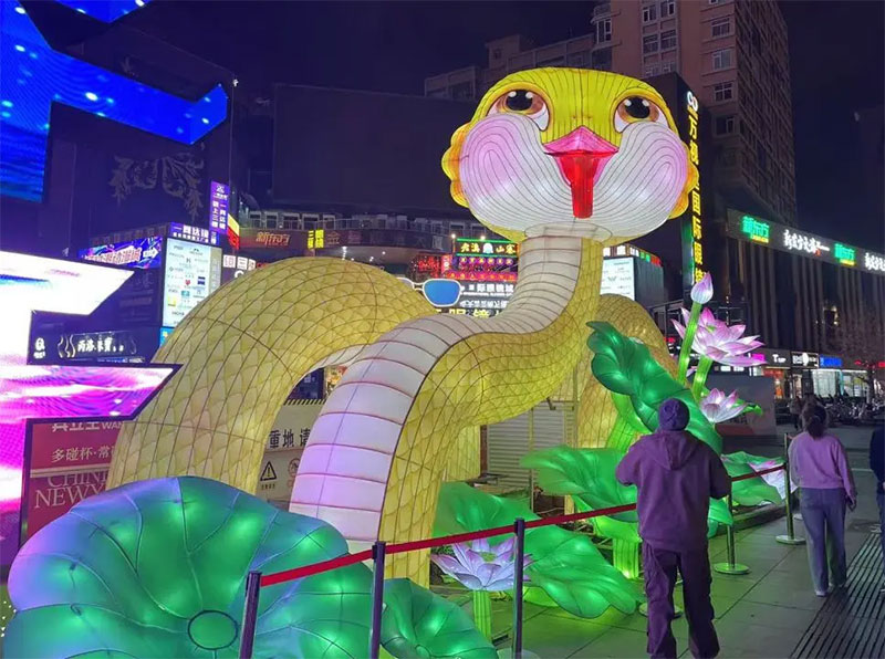 但最早出圈的是云南昆明的這條蛇形花燈。花燈蛇蛇身細長,通體金黃,周圍布滿綠葉與荷花,蛇頭圓潤飽滿,臉部腮紅鮮艷配上卡姿蘭大眼睛,正吐著紅色的信子。獨特的造型,引起了網友踴躍評論:“它是吃了涼拌見手青嗎?”“太抽象了,很難評”“我很少用‘鬼迷日眼’形容一條蛇!”。